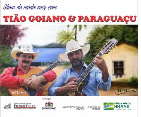 A dupla sertaneja Tião Goiano e Paraguaçu celebra a moda caipira com live-show no próximo dia 10 de fevereiro, quarta-feira, às 20h, com apresentação de músicas do repertório do grupo. O show, transmitido pelas redes sociais da dupla no Facebook, no endereço https://www.facebook.com/tiaogoianoeparaguacu, é um dos projetos aprovados com recursos federais da Lei Aldir Blanc e realizado por meio do Fundo Municipal de Cultura de Guarulhos (FunCultura).