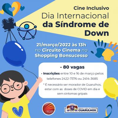 Ainda há vagas para pessoas com deficiência participarem do Cine Inclusivo no próximo dia 21 (segunda-feira), às 13h. Trata-se de uma sessão gratuita no Circuito Cinema do Shopping Bonsucesso em alusão ao Dia da Síndrome de Down. As inscrições devem ser feitas pelos telefones 2422-7376 ou 2414-3685, das 8h às 17h.