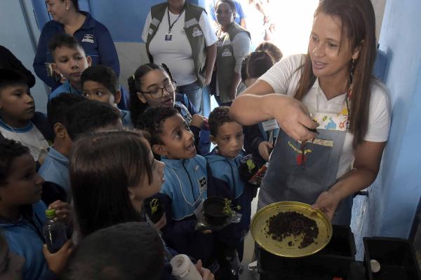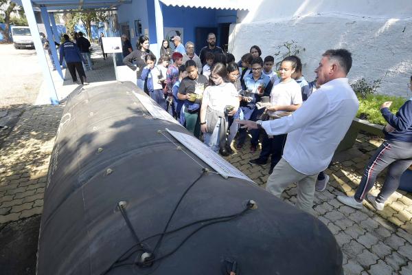 Empolgadas com as novidades do espaço, as crianças do 5º ano do ensino fundamental participaram de jogos educativos sobre a destinação correta de resíduos, conheceram o biodigestor e aprenderam na prática como restos de alimentos, dentre eles cascas de frutas e de legumes, podem ser transformados em adubo orgânico por meio de diferentes métodos de compostagem.
