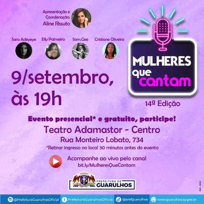 Nesta sexta-feira (9), às 19h, o Teatro Adamastor recebe o projeto Mulheres que Cantam, show-live com artistas guarulhenses que tem como objetivo mostrar a força da música brasileira, representada na expressividade da voz feminina, destacar o protagonismo da mulher e exaltar o talento de cantoras e vozes em busca de espaço no cenário musical. O evento é presencial e aberto ao público, com transmissão pelo canal do projeto no YouTube.