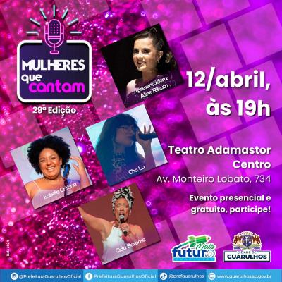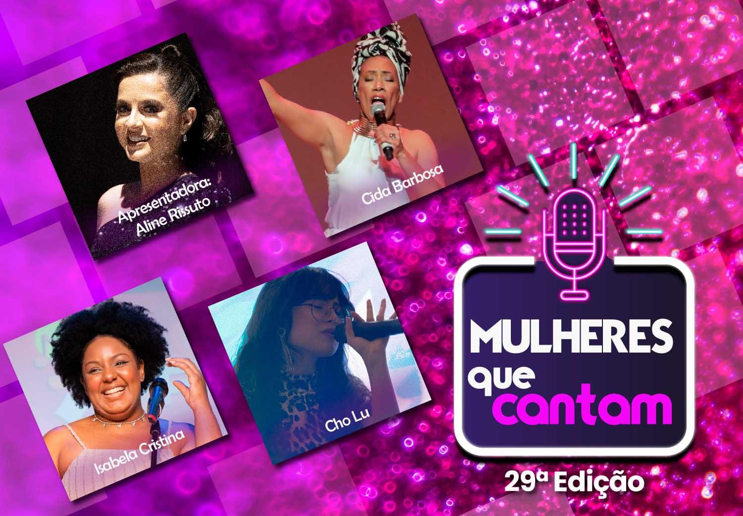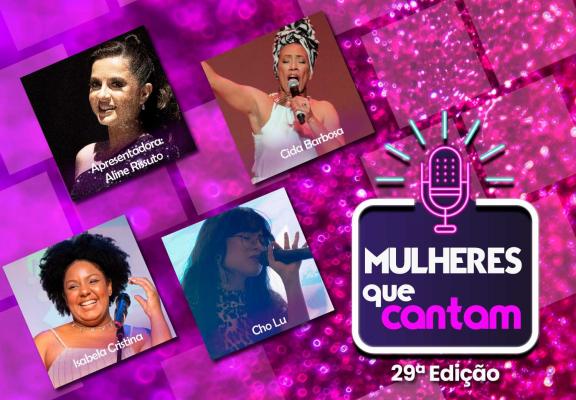 As cantoras Cho Lu, Cida Barbosa e Isabela Cristina sobem ao palco do Teatro Adamastor nesta sexta-feira (12), às 19h, para a 29ª edição do programa Mulheres que Cantam, que tem classificação livre e é aberto ao público em geral.