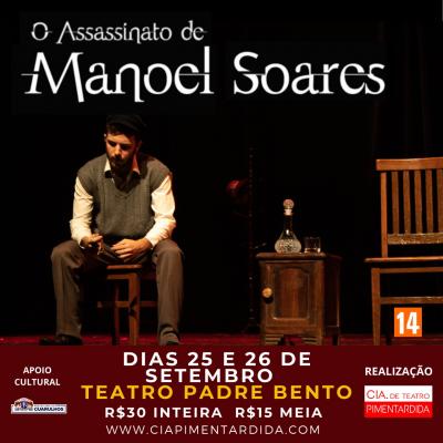 A Cia. De Teatro PimentArdida estreia sua temporada neste sábado (25) e domingo (26) no Teatro Padre Bento, às 20h, com o espetáculo O Assassinato de Manoel Soares, escrito e dirigido por Italo Soares. A peça já estava no papel há um tempo, mas só pôde ser finalizada e ter sua estreia graças à aprovação do projeto Teatro Social pela Lei Aldir Blanc. Os ingressos já estão disponíveis no site ciapimentardida.com e na compra antecipada será entregue um brinde exclusivo.