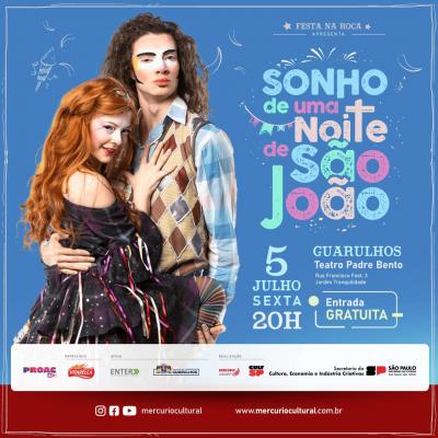 No próximo dia 5 de julho (sexta-feira), às 20h, o Teatro Padre Bento recebe o espetáculo Sonho de uma Noite de São João. A apresentação gratuita integra o evento Festa na Roça, que une teatro e gastronomia com a promessa de resgatar e celebrar os encantos da vida caipira em toda a sua essência.