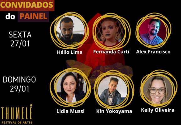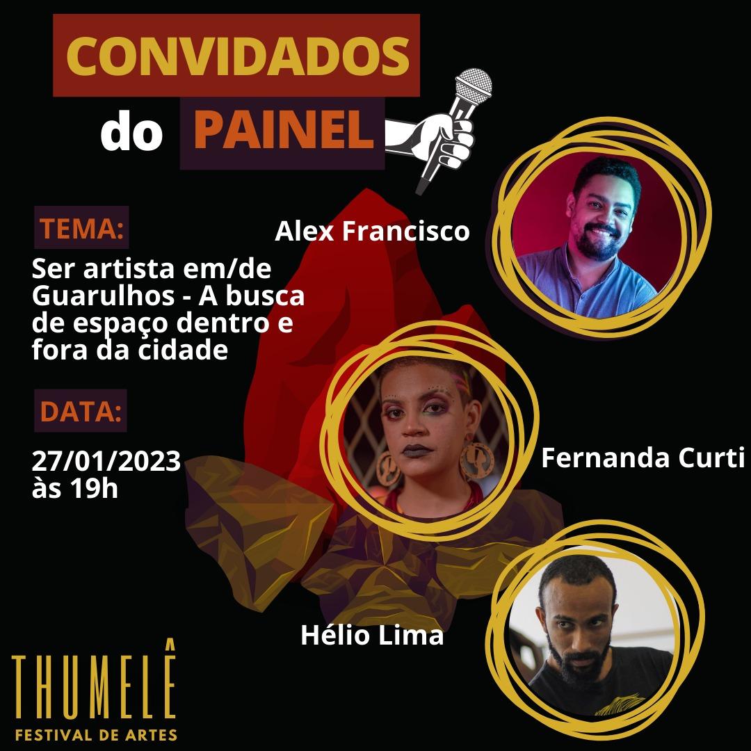 O Coletivo Étmus, responsável pela curadoria da primeira edição do Thumelê Festival de Artes, anunciou o nome dos participantes que irão compor a mesa de bate-papo do painel de artes nos dias 27 e 29 de janeiro. O Thumelê reunirá diferentes manifestações artísticas de Guarulhos e região nos dias 27, 28 e 29 no auditório Pedro Dias Gonçalves, no complexo da Biblioteca Monteiro Lobato, no centro.