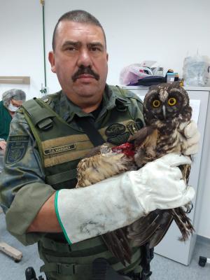 Outra espécie salva pelas equipes foi uma coruja-buraqueira. Ela estava enroscada em linha de pipa e segue em tratamento para sua recuperação total.