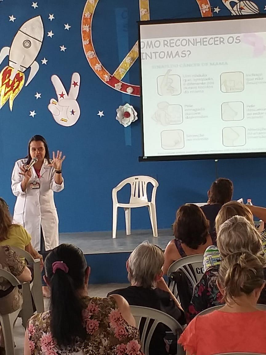 Aproximadamente 40 idosas frequentadoras da unidade Santa Mena do Centro de Convivência do Idoso (CCI), participaram nesta quarta-feira (16) da Roda de Conversa Outubro Rosa: prevenção na terceira idade. A ação socioeducativa conduzida pela psicóloga Margarete Mota, contou com a presença da enfermeira Neidna Cilene de Melo, da UBS Flor da Montanha, que abordou a necessidade de prevenção e tratamento do câncer de mama e de ovário.