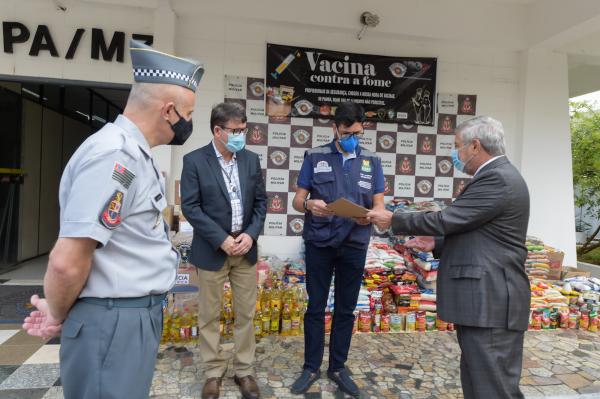 Nesta terça-feira (27) foram entregues duas toneladas de alimentos arrecadados durante a campanha de imunização contra a covid-19 realizada para os profissionais de segurança pública do Estado de São Paulo. A solenidade aconteceu na sede do Comando do Policiamento de Área Metropolitano 7 (CPAM-7), na Vila Tijuco, e os itens serão destinados ao programa Restaurante do Bem, da Prefeitura, que oferece diariamente 1.100 refeições às pessoas em vulnerabilidade social afetadas pela pandemia em dez pontos de Guarulhos.