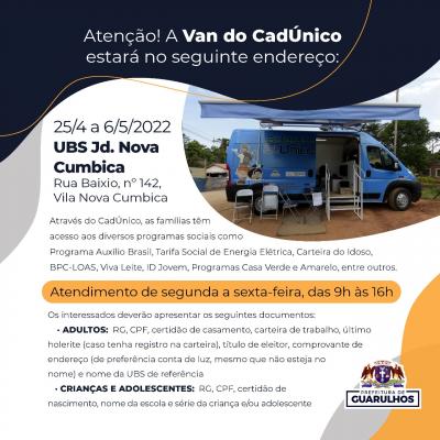 A partir da próxima segunda-feira (25) a população da região de Cumbica poderá buscar atendimento socioassistencial na Van do CadÚnico, que estará na UBS Jardim Cumbica até o dia 6 de maio, de segunda a sexta-feira, das 9h às 16h. O equipamento ficará no estacionamento da unidade, na rua Baixio, 142, Vila Nova Cumbica.