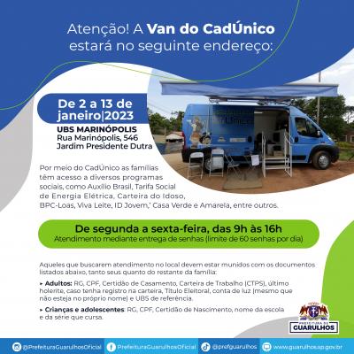 A van do Cadastro Único para Programas Sociais (CadÚnico) estará na UBS Marinópolis (rua Marinópolis, 546, Jardim Presidente Dutra) entre os dias 2 e 13 de janeiro, das 9h às 16h, de segunda a sexta-feira, para atender interessados em acessar diversos programas sociais, como Auxílio Brasil, Tarifa Social de Energia Elétrica, Carteira do Idoso, BPC-Loas, Viva Leite, ID Jovem e Casa Verde e Amarela. Diariamente serão entregues 60 senhas aos interessados.