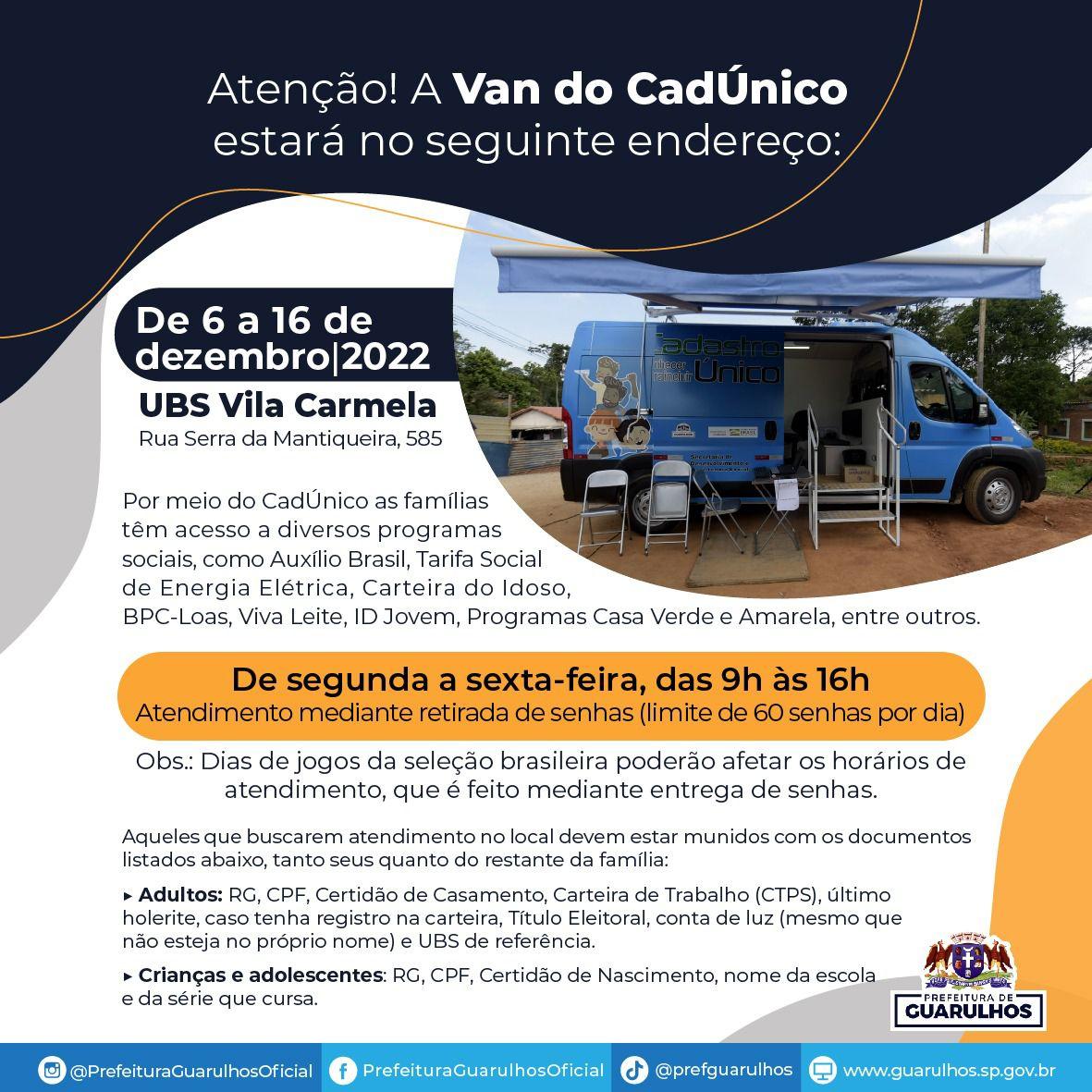 A Van do CadÚnico, equipamento de assistência social da Prefeitura de Guarulhos, atenderá entre os dias 6 e 16 de dezembro na UBS Vila Carmela, na rua Serra da Mantiqueira, 585. A população poderá procurar a van de segunda a sexta-feira, das 9h às 16h, exceto em dias de jogo da Seleção Brasileira na Copa do Mundo, quando o expediente se encerra ao meio-dia.
