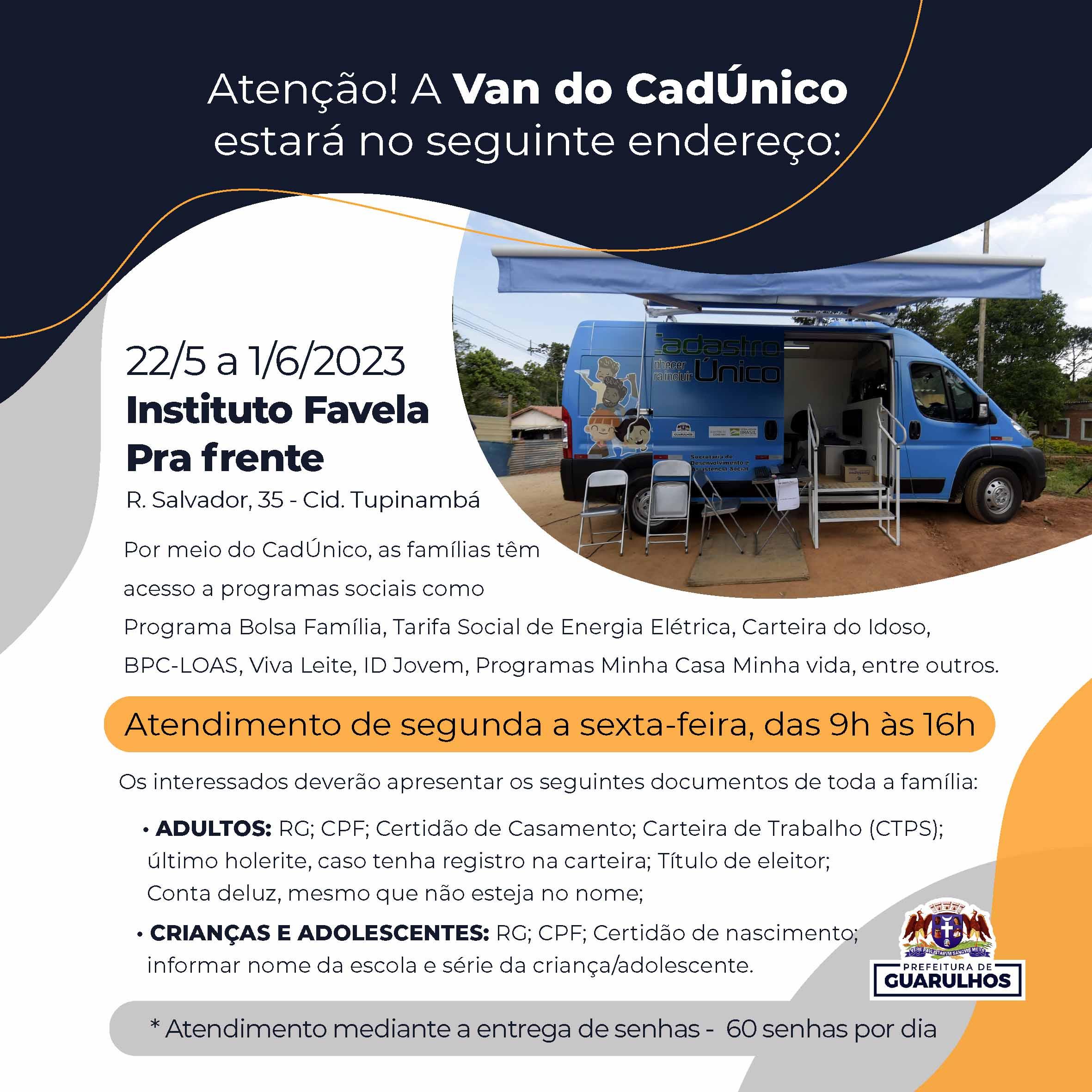 A van do CadÚnico, equipamento móvel de assistência social da Prefeitura de Guarulhos, estará no Instituto Favela pra Frente, na rua Salvador, 35, Cidade Tupinambá, entre esta segunda-feira (22) e 1º de junho. A população será atendida no local de segunda a sexta-feira, das 9h às 16h, e 60 senhas serão distribuídas por dia.