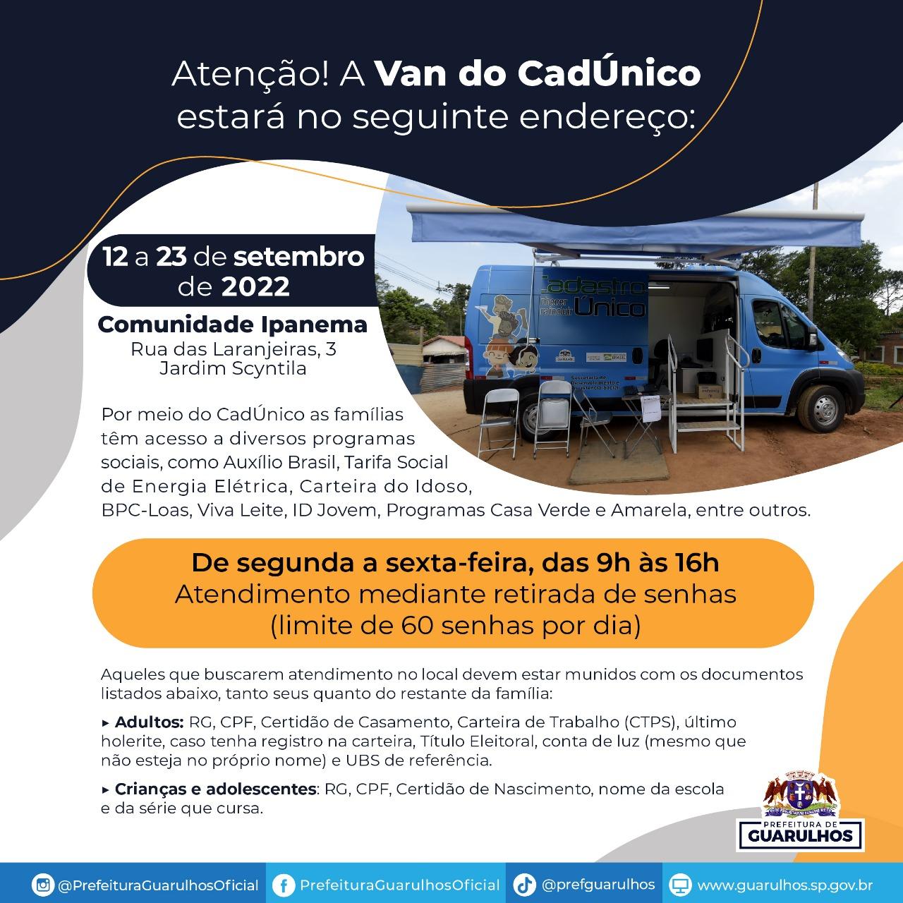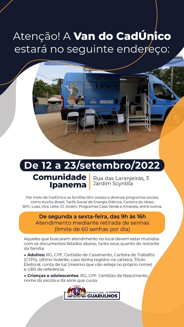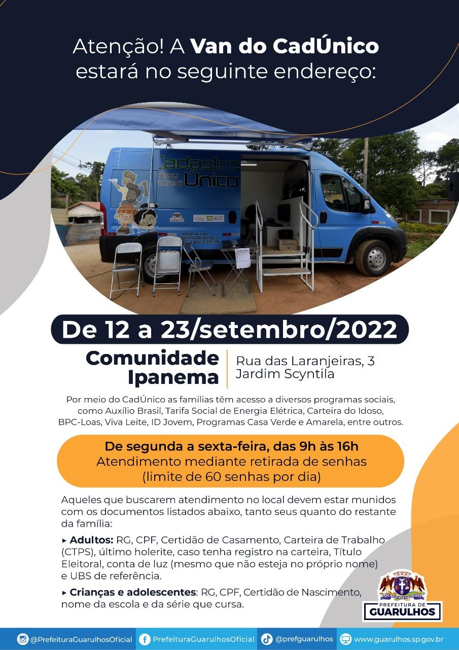 Entre os dias 12 (segunda-feira) e 23 de setembro a Van do CadÚnico irá atender na Comunidade Ipanema. O equipamento da Prefeitura de Guarulhos funcionará de segunda a sexta-feira, das 9h às 16h, na rua das Laranjeiras, 3, Jardim Scyntila. O atendimento será realizado por meio da entrega de senhas, que acontecerá todos os dias às 9h. Serão distribuídas 60 senhas por dia.