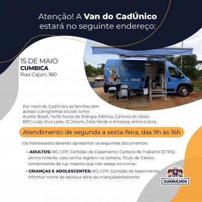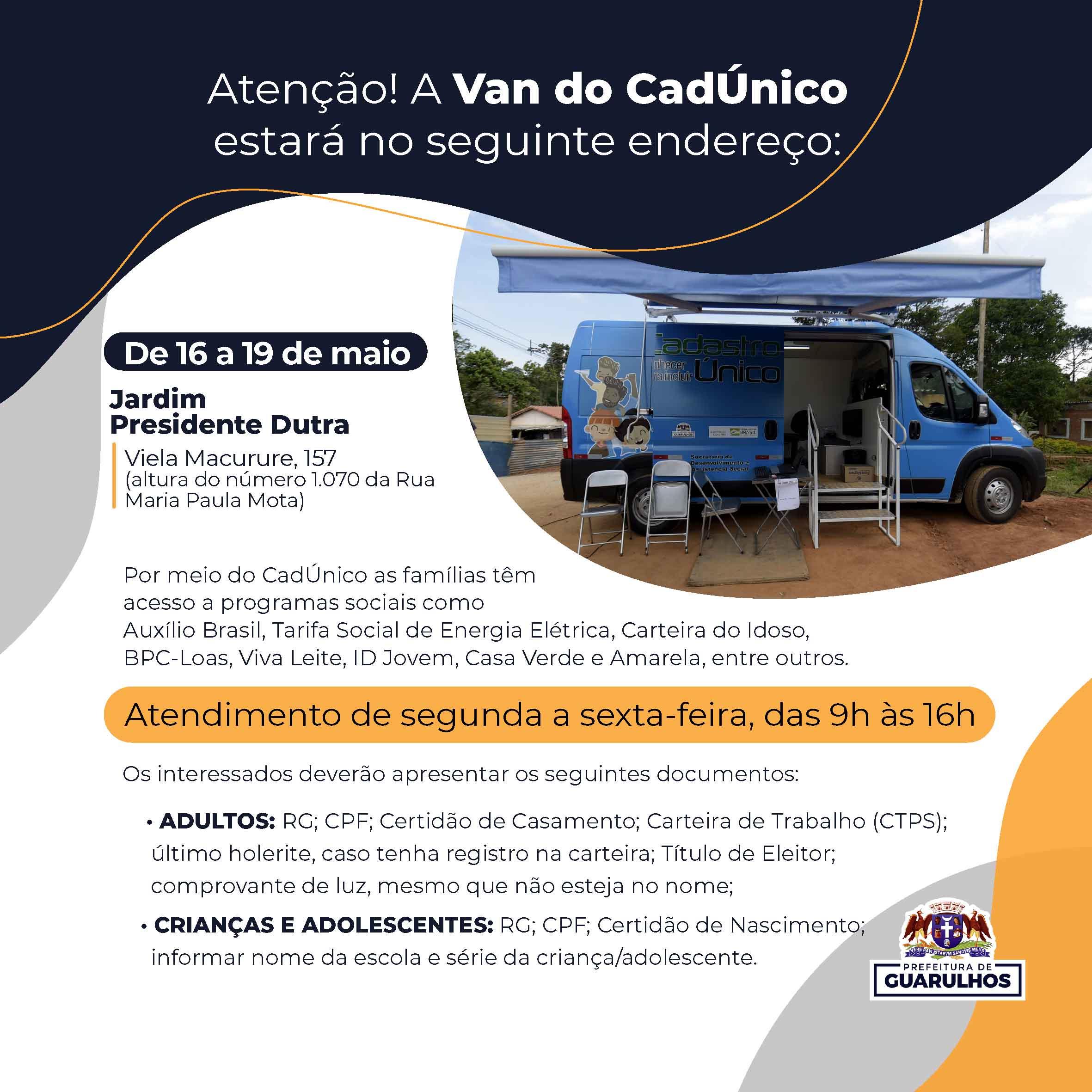 A Van do CadÚnico percorrerá dois bairros na semana que vem. No dia 15 de maio, segunda-feira, o equipamento estará em Cumbica (rua Cajuri, 160) e, no restante da semana, entre os dias 16 e 19, o atendimento acontecerá no Jardim Presidente Dutra, na viela Macurure, 157, altura do número 1.070 da rua Maria Paula Mota.