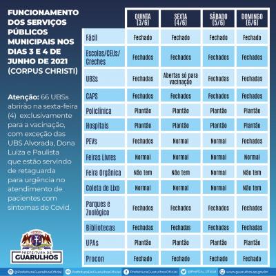 Em razão do feriado de Corpus Christi nesta quinta-feira (3) e da decretação do ponto facultativo na sexta-feira (4), confira na imagem o funcionamento dos serviços públicos municipais em Guarulhos nesse período.