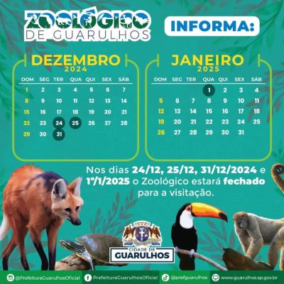 O Zoológico de Guarulhos informa que estará fechado à visitação pública nesta terça e quarta-feira, dias 31 e 1º. O parque volta a abrir no dia 2 de janeiro, às 9h.