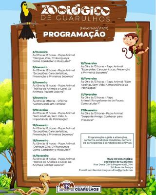 A atividade é parte da programação de fevereiro do zoo, que terá ainda encontros sobre os impactos do tráfico de animais e do uso do cerol sobre os animais, importância das abelhas para a manutenção da vida no planeta, dengue, zika e chikungunya, serpentes, entre outros assuntos. A agenda completa está disponível em https://www.facebook.com/zoologico.guarulhos/.