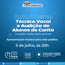O Conservatório Municipal de Guarulhos receberá no dia 3 de julho (quarta-feira), às 20h, uma aula aberta ao público de técnica vocal e audição de alunos de canto.