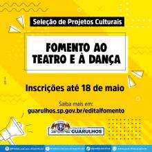 A Prefeitura de Guarulhos prorrogou para 18 de maio o prazo de inscrições para o processo seletivo de fomento ao teatro e à dança, edital destinado a artistas de Guarulhos, grupos ou coletivos cult