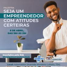 Para estimular o empreendedorismo na cidade, a Prefeitura de Guarulhos realizará no dia 6 de abril a palestra “Seja um Empreendedor com Atitudes Certeiras”, em parceria com o Serviço Brasileiro de