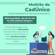 O segundo mutirão do Cadastro Único para Programas Sociais (CadÚnico) de 2022 ocorrerá no CEU Ottawa-Uirapuru (avenida Morada Nova, 208, Jardim Ottawa) no próximo sábado (26), das