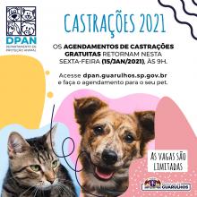 O Departamento de Proteção Animal (DPAN) de Guarulhos retoma nesta sexta-feira (15), a partir das 9h, o agendamento online para castração gratuita de cães e gatos para tutores de todas as regiões d