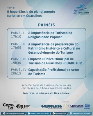 A 21ª edição da Conferência Municipal de Turismo de Guarulhos é realizada pela Secretaria de Cultura e Turismo de Guarulhos em parceria com o Conselho Municipal de Turismo de Guarulhos (Comtur).