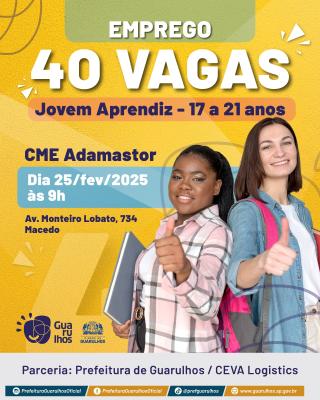 Em parceria com a Prefeitura de Guarulhos, a empresa Ceva Logística contrata candidatos para 40 vagas de jovem aprendiz. A seleção será no próximo dia 25 (terça-feira), às 9h, no Centro de Educação Municipal Adamastor, no Macedo. Os interessados devem ter entre 17 e 21 anos de idade, ensino médio completo ou em curso e comparecer com documentos pessoais.