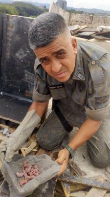No primeiro caso, 12 filhotes recém-nascidos estavam em meio às obras da CCR RioSP, na rodovia Presidente Dutra, altura do km 219, no novo viaduto de ligação com a rodovia Hélio Smidt. Funcionários acionaram a Central 153 porque os filhotes não estavam com a mamãe saruê e poderiam morrer.
