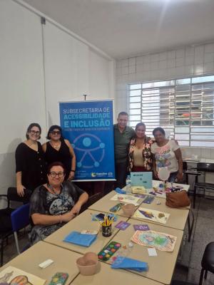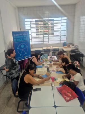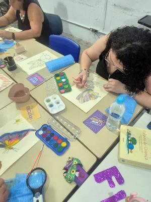 Nesta quarta-feira (18), a Subsecretaria de Acessibilidade e Inclusão promoveu mais uma edição gratuita da vivência arteterapêutica Mulheres de Fibra: Transformando Dor em Cor, com um grupo de mulheres com fibromialgia, em sua sede, no Macedo. O objetivo foi possibilitar que as participantes expressassem seus sentimentos em um ambiente seguro, por meio da pintura, e pudessem trocar experiências num espaço de ajuda mútua.