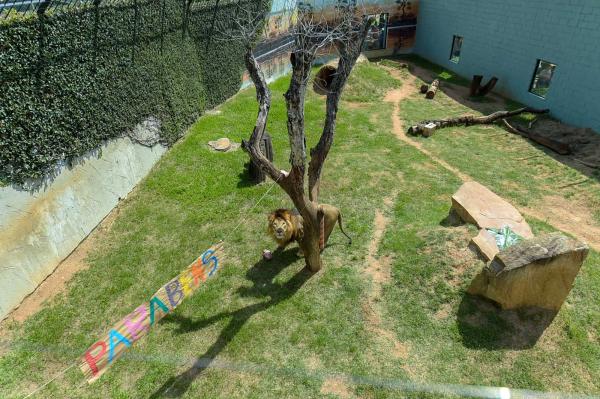 O Zoológico de Guarulhos comemorou nesta quinta-feira (19) o aniversário de cinco anos do leão Madiba. Como nos anos anteriores, o recinto dos grandes felinos recebeu enriquecimento ambiental em forma de caixas de papelão decoradas como presentes espalhadas pelo ambiente e um bolo de carne.